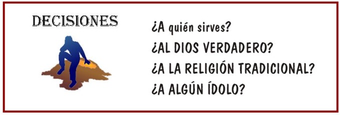 1. Josué puso delante del pueblo su ejemplo: él y su casa ya habían escogido servir a Jehová. 2. Después puso delante de ellos tres opciones: a) Servir a Jehová. El Dios que los sacó de Egipto con mano poderosa. b) Servir al becerro de oro. La religión que inventaron las mentes débiles de sus padres. c) Servir a Baal y a otros dioses, siguiendo las costumbres de los pueblos vecinos. 3. Hoy tienes las mismas opciones: a) Servir al único y soberano Dios, del que nos habla la Biblia. b) Servir a un dios elaborado por los creyentes que, porque su fe es débil, no aceptan todo lo que la Biblia dice. c) Seguir las costumbres y los pensamientos de los vecinos que dicen en su corazón: No hay Dios.